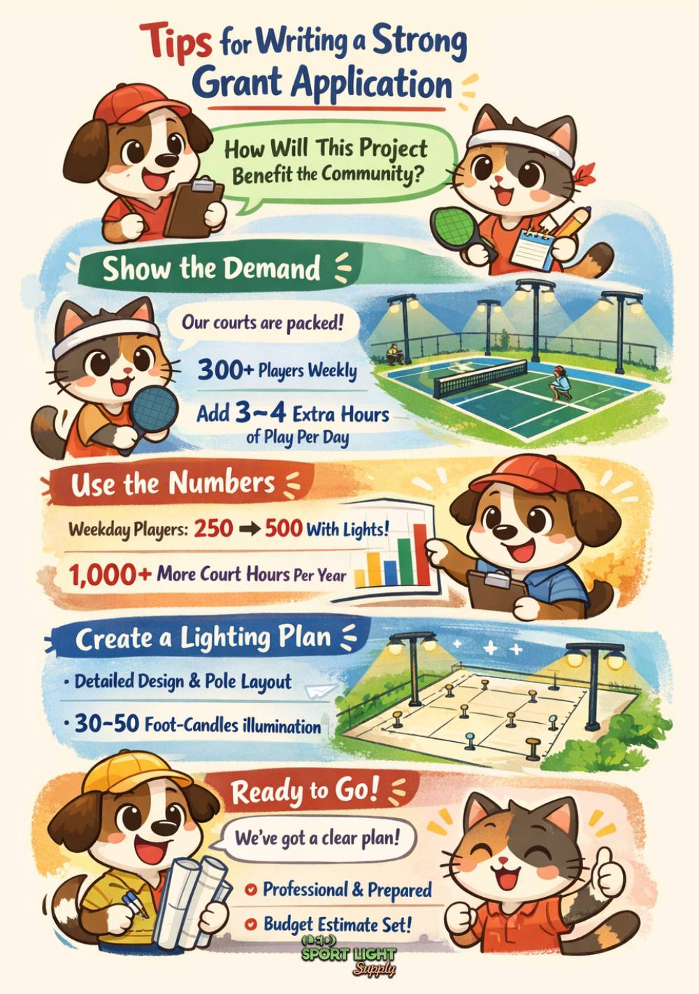 Getting a grant for pickleball court lighting is not only about finding the right funding program. A big part of the process comes down to how clearly the proposal explains the benefits of the project. Grant reviewers often read dozens, sometimes hundreds, of applications. The proposals that stand out are usually the ones that present a clear story, supported by numbers and real community needs.
